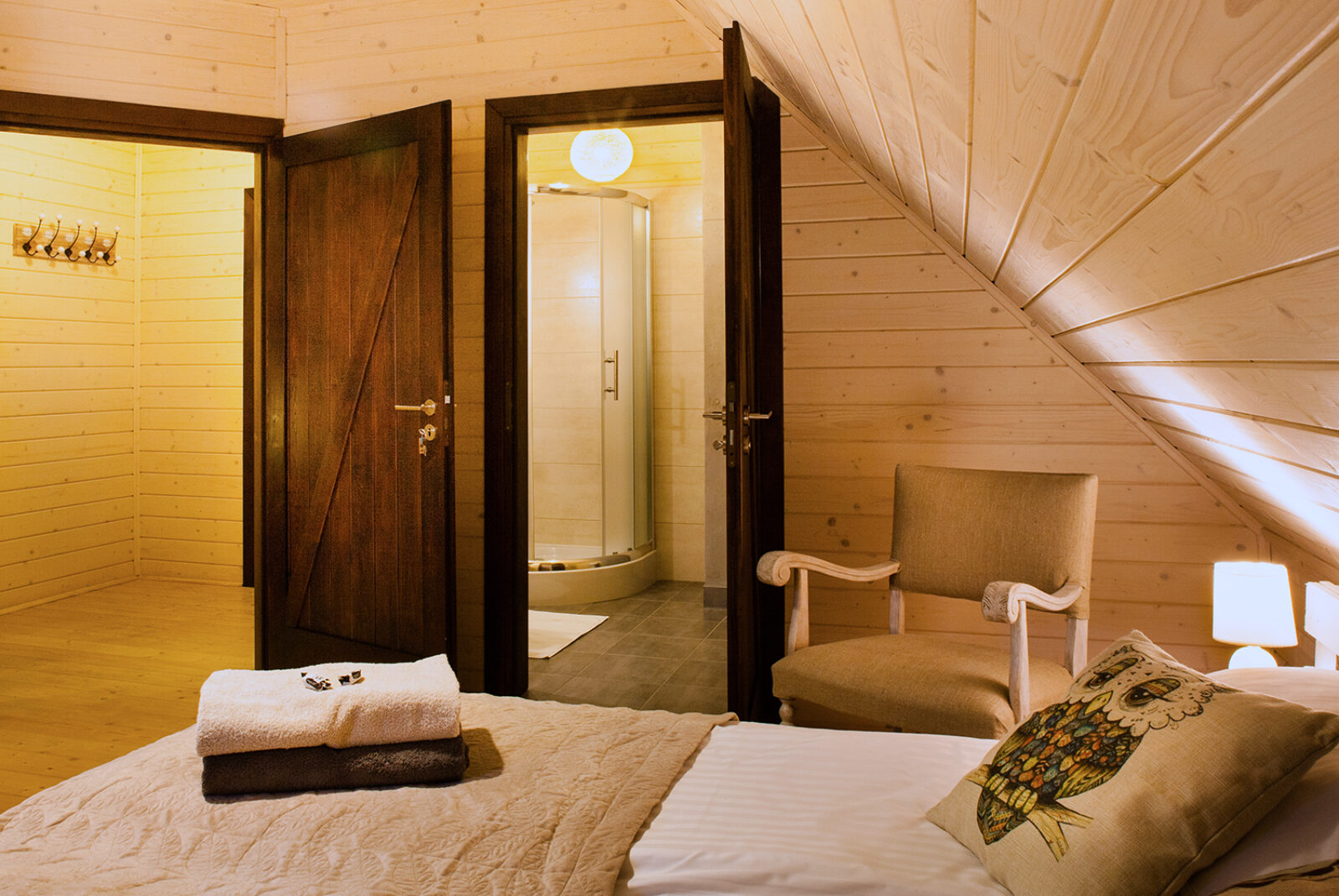 „Sówki” to możliwość zakwaterowania maksymalnie 2 osób – podwójne lub pojedyncze łóżka, bez możliwości wstawienia dostawki lub zakwaterowania dziecka w łóżku z rodzicami.